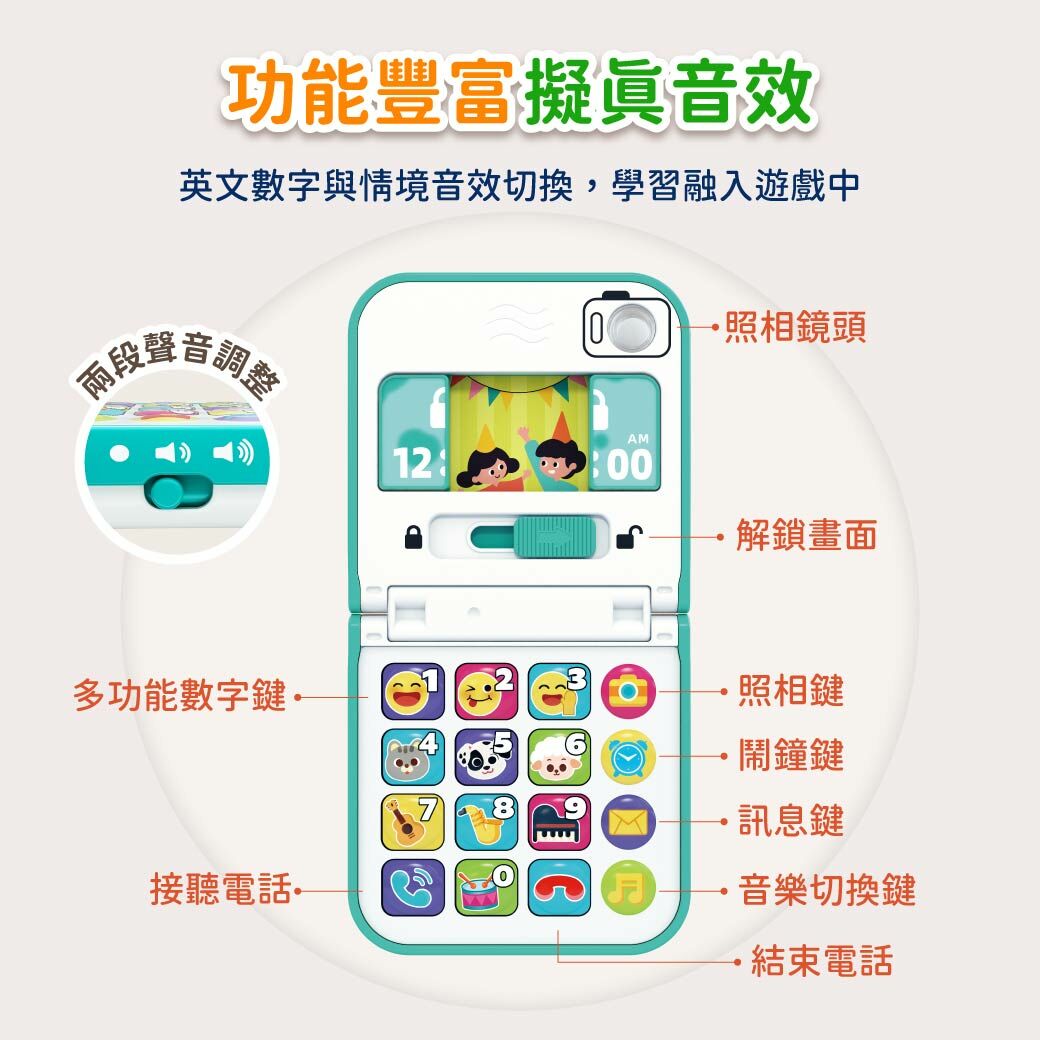 擬真鬧鈴、簡訊、拍照、接聽音效
